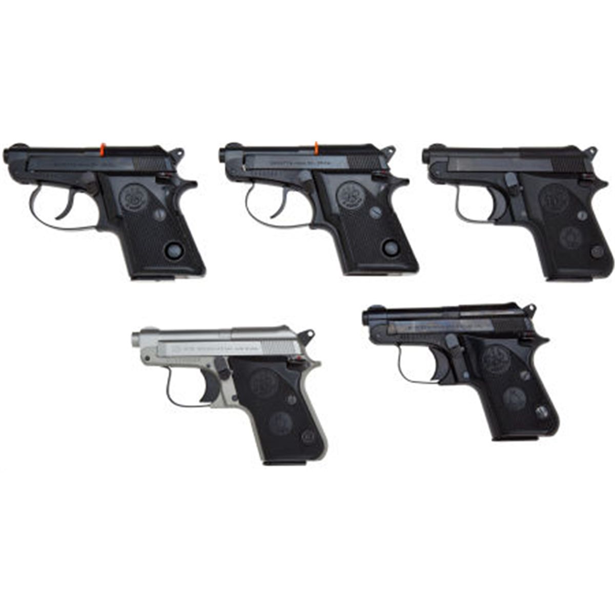 Lot of 5 Beretta M20 and 950 Semi-Automatic Pistols. (1) Serial no. DAA258509, .25 ACP, 2.5" barrel, Stainless steel finish, black plastic grips, single action, 8 shot mag, comes with one-8 shot magazines, manual and lock in factory Beretta cardboard box. MSR $267. Made in U.S.A. (2) Serial no. BER01787V, BR32806V, .25 ACP, 2.5" barrel, blue finish, black plastic grips, single action, 8 shot mag, comes with one-8 shot magazines, manual & cleaning brush in factory Beretta cardboard box. MSR $226. Made in U.S.A. 2 Each. (3) Serial no. BE39388V, BE39400V, .25 ACP, 2.5" barrel, blue finish, black plastic grips, DOUBLE action, each comes with one-9 shot magazine, manual & cleaning brush in factory Beretta cardboard box. MSR $214 each, Made in U.S.A. 2 Each" Condition: As-New in factory boxes. Bores are bright, actions crisp.NRA FIREARMS FOR FREEDOM PROGRAM