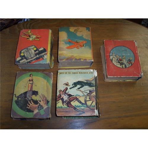 We are offering a lot of 5 of The Big Little Books to include: Mandrake the Magician (1935), Tailspin Tommy and the Sky Bandits (1938), Hall of Fame in the Air (1936), Tim Tyler's Luck Adventures in the Ivory Patrol (1936 and (1937), and Skeezix in Africa (1933, 1934). Books have age wear - all page appear to be accounted for. Some have pages separating from spine. Three (3) books have previous owner's name written on the inside cover. Overall condition of books: Very good. All publish by Whitman Publishing Co.