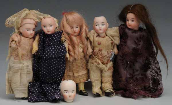Description Germany, Ca. 1900. All incised "39 13", all have painted eyes, closed mouths, five-piece papier-maché bodies, two have original clothes. Together with a bisque head and wig. Condition (Very Good). Size All: 5 - 1/2" T.