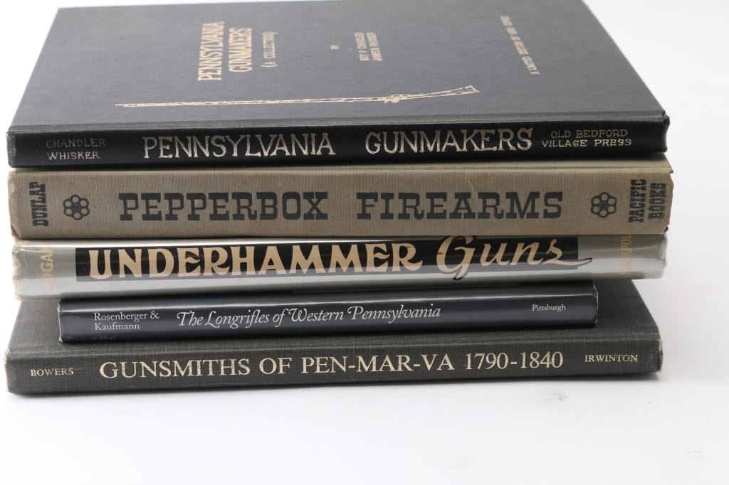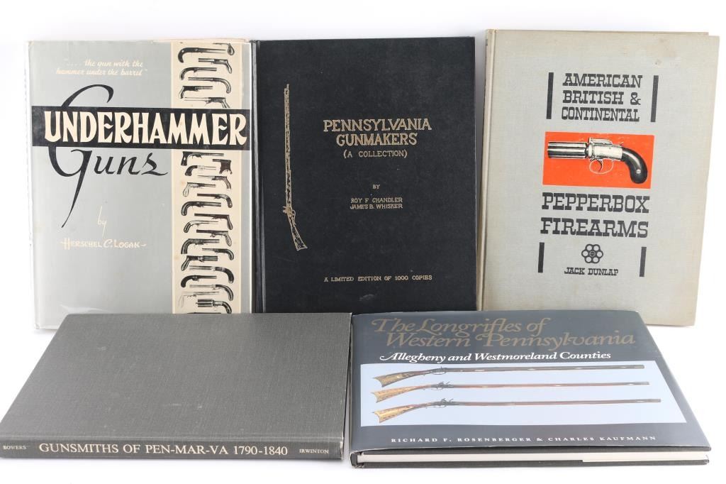 Includes: The Longrifles of Western Pennsylvania Allegheny and Westmoreland Counties by Richard F. Rosenberger and Charles Kaufmann. Signed by Rich Rosenberger; American British & Continental Pepperbox Firearms (1st Ed.) by Jack Dunlap; Pennsylvania Gunmakers A Collection (Limited Ed.) by Roy F. Chandler & James B. Whisker; Gunsmiths of Pen-Mar-Va 1790-1840 and signed by the author William S. Bowers; Underhammer Guns (1st Ed.) by Herschel C. Logan.