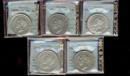 Lot of 5 CCCS graded Silver dollars; 1936 MS60, 1945 EF40 rim nicks, 1950 SWL AU50, 1950 Arnp EF40.