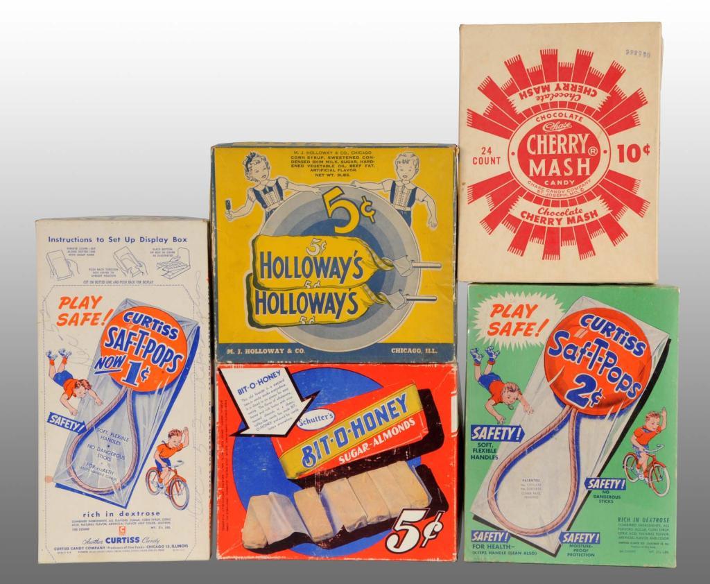 Description 1950s to 1960s. Includes two Curtiss Saf-T-Pops, one Bit-O-Honey, one Cherry Mash, and one Holloway's. Some overall wear to all boxes and in various sizes. Condition (Good - Excellent). Size Curtiss box: 8 - 1/2" x 11".