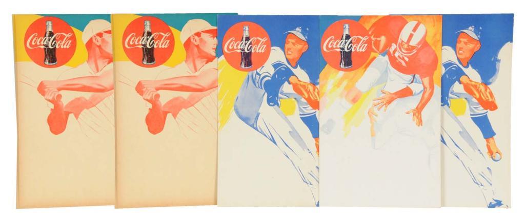 Includes four baseball images and one football. All were never used. Light overall soiling and minor marks with slight ambering. Condition (8.0 - 8.5, Excellent). Size All: 13" x 21".