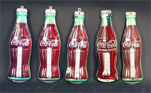 Lot of 5 "Coke" Coca-Cola thermometers 1 rare 50's flat, 2 Donasco Bottle, 1 Robertsons and 1 "Made in the USA" ea. 17" high