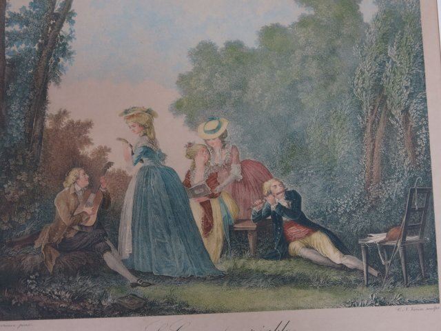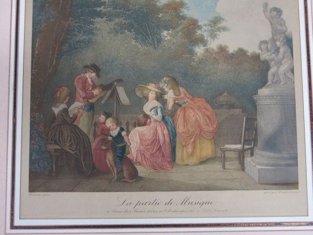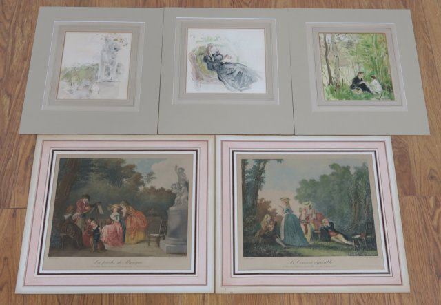 (3) After Berthe Morisot. One signed in plate. Approx. 9" H x 8" W unframed, 17" H x 15" W on liner. (2) After Langlois le Jeune. Approx. 12" H x 14" W unframed, 17" H x 19" W on liner. All mounted on cardboard liners, unframed. 5 pieces total. Property of a Bernardsville NJ collection (4069).