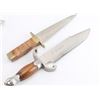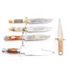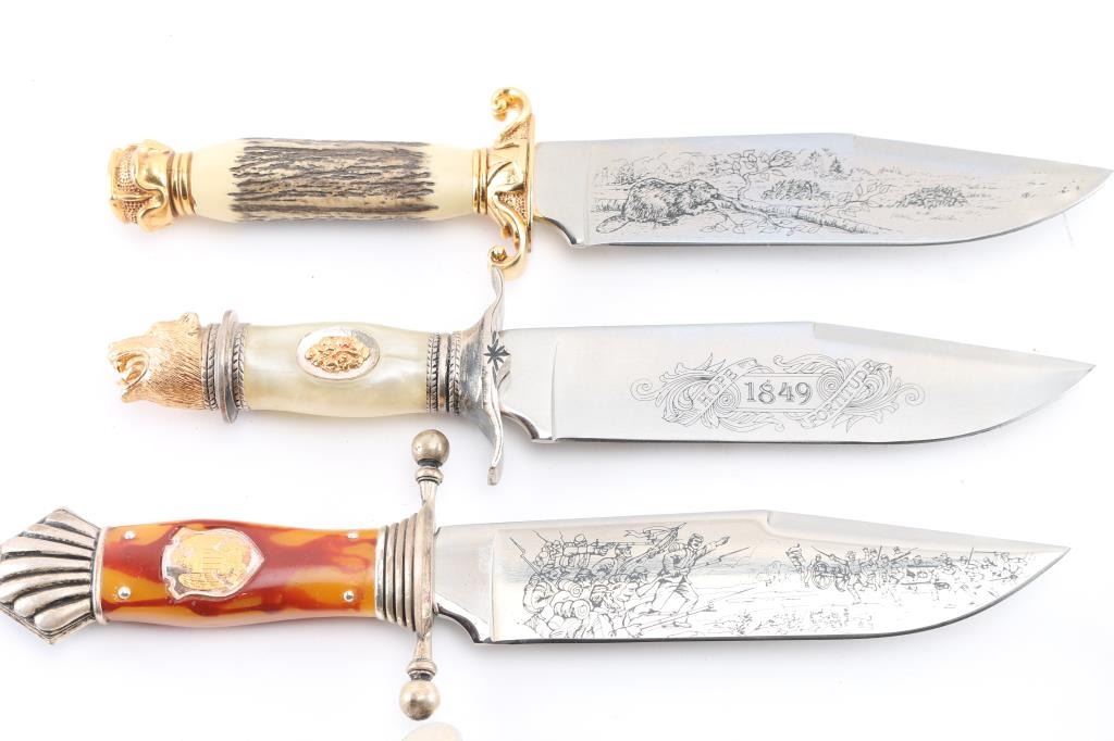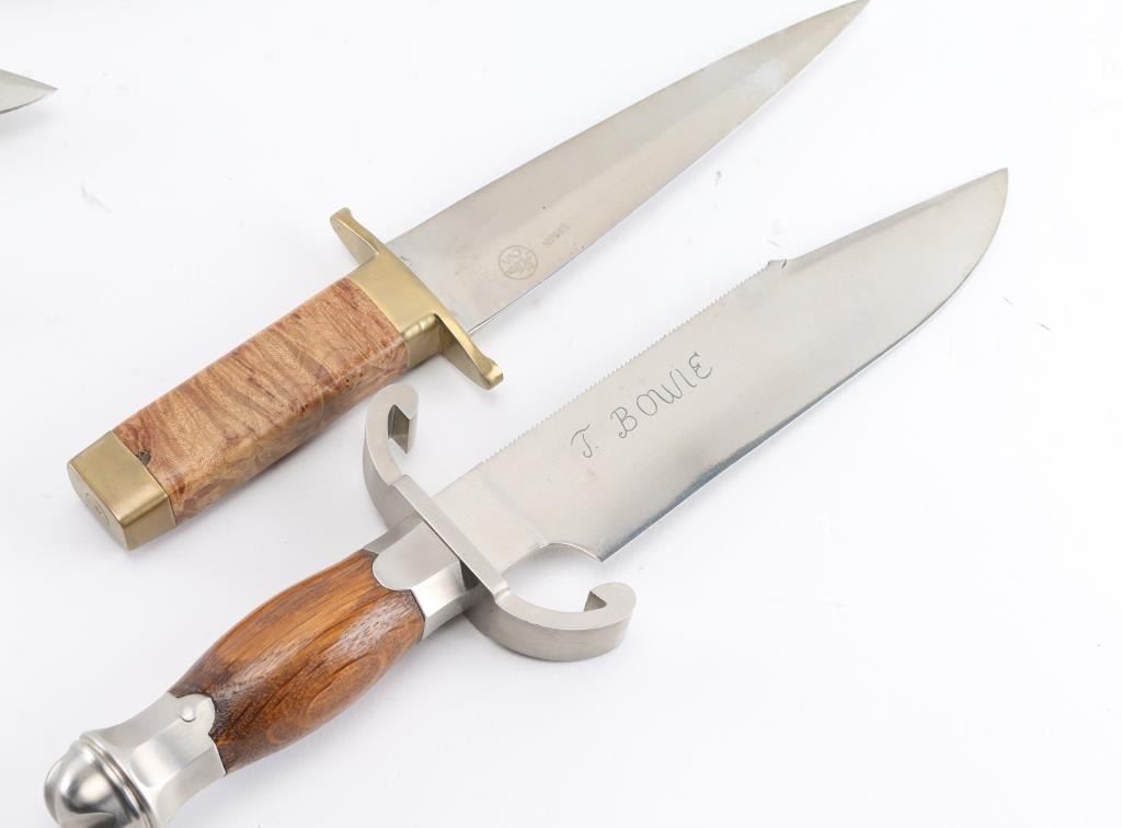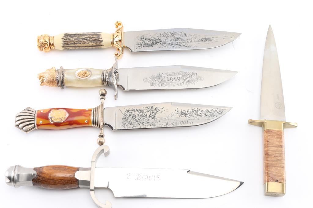 includes the following excellent condition knives: 1) Arkansas Toothpick style with "CVA" marked 7" blade, fancy maple handle 2) faux stag handled bowie with 7" blade, etched with nature scene of beaver & dam 3) faux pearl handled Bowie, 7" blade,"Hope / 1849 / Fortitude" on blade, some losses to plating on cross guard 4) walnut handled "J Bowie" marked 7" saw back bladed bowie 5) polymer handled (with inset federal eagle) 7' bladed bowie with US Civil War scene