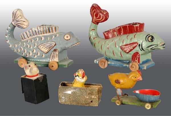 European. Includes two fish platform toys, one chick feeding platform toy marked "Germany" on bottom, one tiger squeak toy that is lever activated and makes noise while it lunges out of box , and one bulldog squeak toy. One small duck not part of lot. All toys show moderate wear. Condition (Very Good). Size Largest: 9" L.