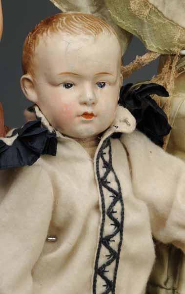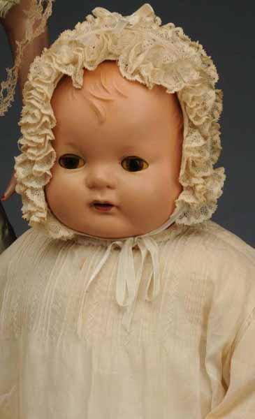 Description Boudoir doll with no wig and cracking and peeling composition, original dress and hat. Dolly face head on fully jointed composition body, dressed with vintage shoes. Mama doll, original human hair wig and silk dress (composition dirty, crazed and peeling). Effanbee Sugar Baby, cloth body with composition arms and legs, nicely dressed. Early boy with character face, molded hair and painted eyes after the style of Gebr. Heubach, cloth body, compo shoes and arms (crazing and peeling). Condition (Very Good). Size Largest: 26" T.