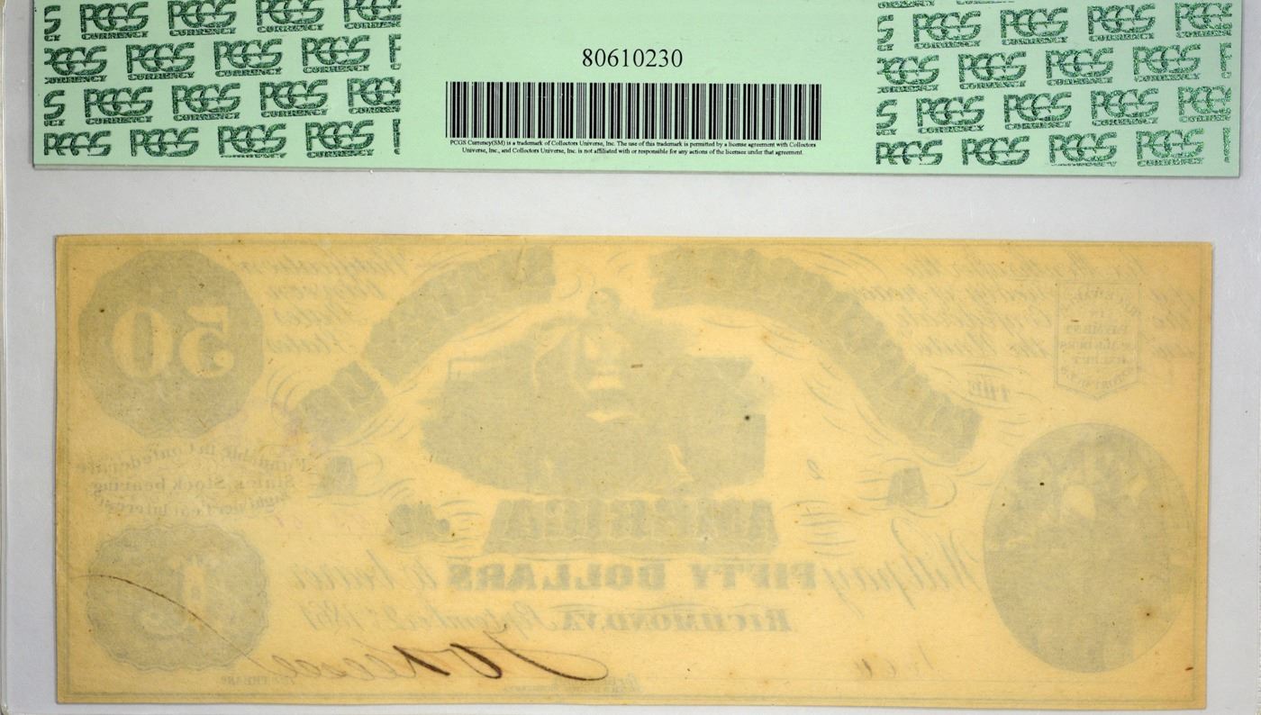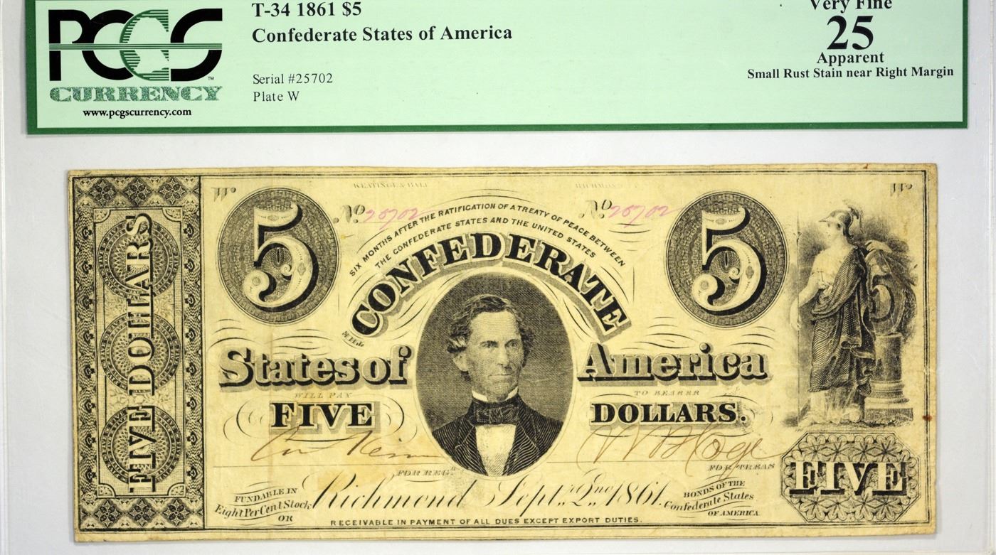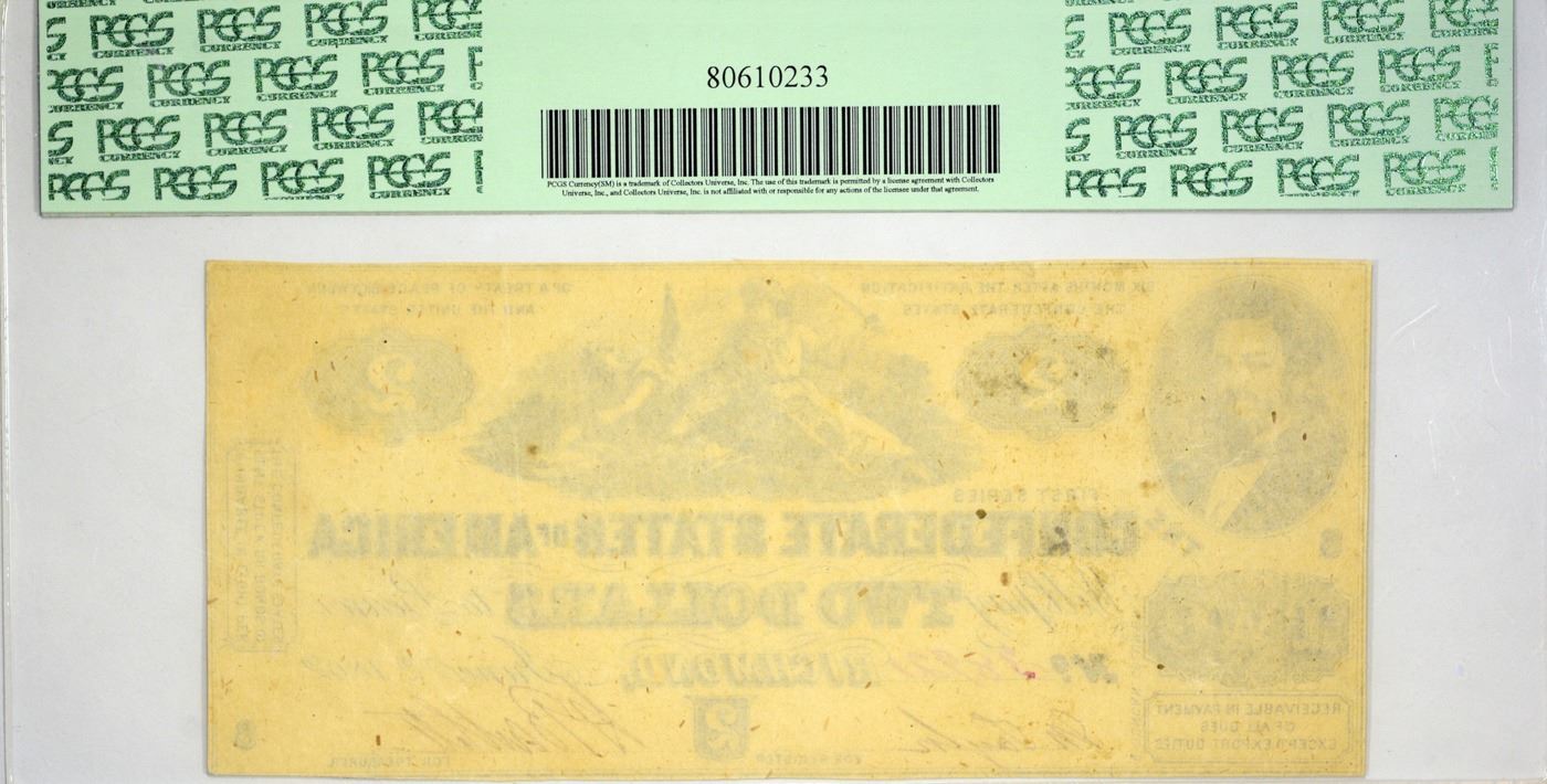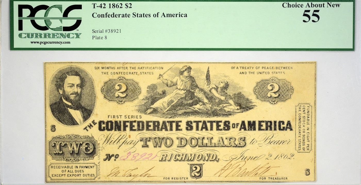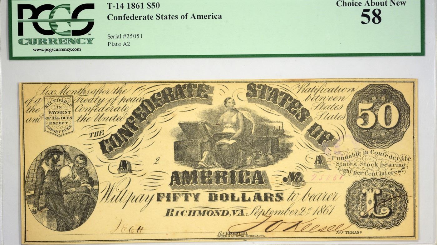 Lot of (5) Confederate Currency Notes. PCGS Graded. Includes the following; T-13 in Extremely Fine 45; T-14 in Choice About New 58; T-34 in Very Fine 25 Apparent. Small Rust Stain near Right Margin; T-42 in Choice About New 55; T-61 in Choice About New 58 Apparent. Repaired Ink Erosion.