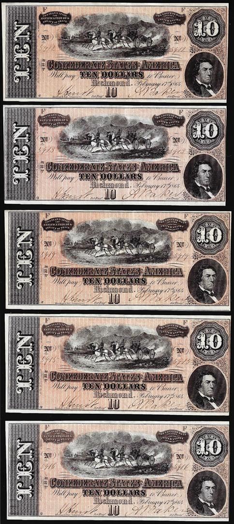 Lot of (5) Consecutive 1864 $10 Confederate States of America Notes
