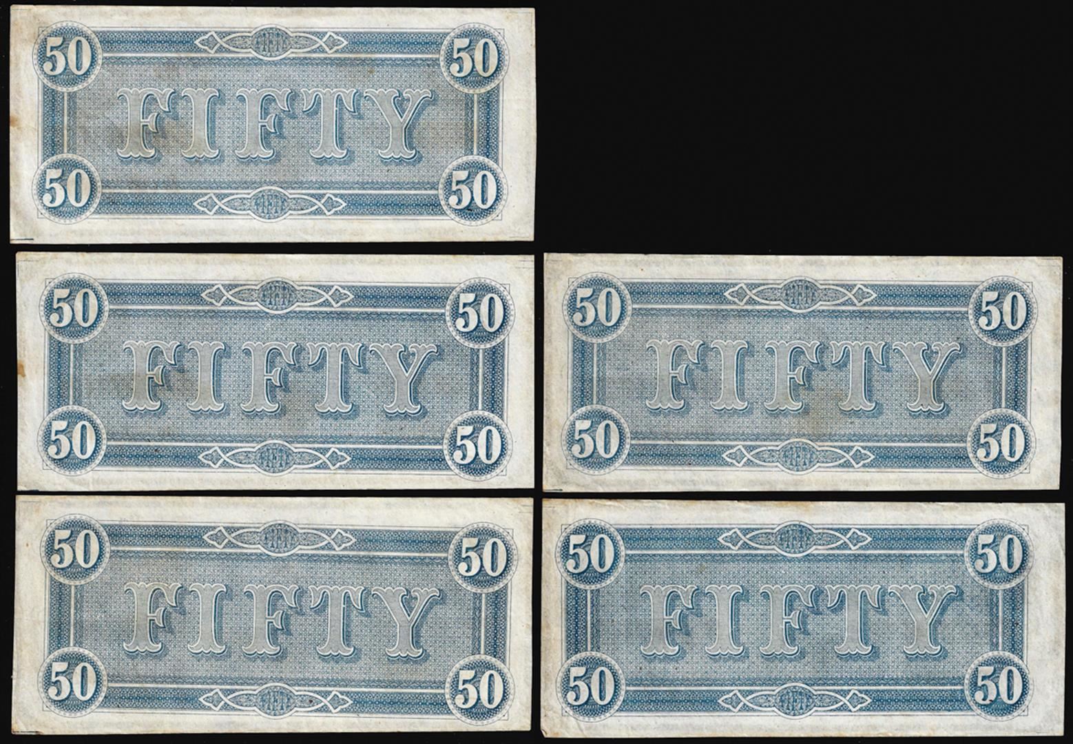 One Lot of (5) Consecutive 1864 $50 Confederate States of America Notes.