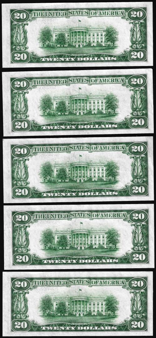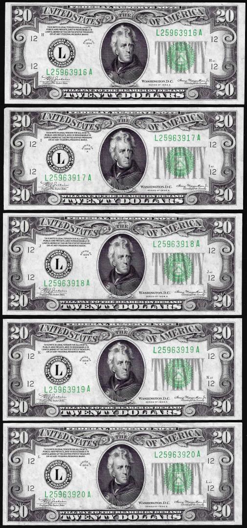 One Lot of (5) Consecutive 1934A $20 Federal Reserve Notes San Francisco.