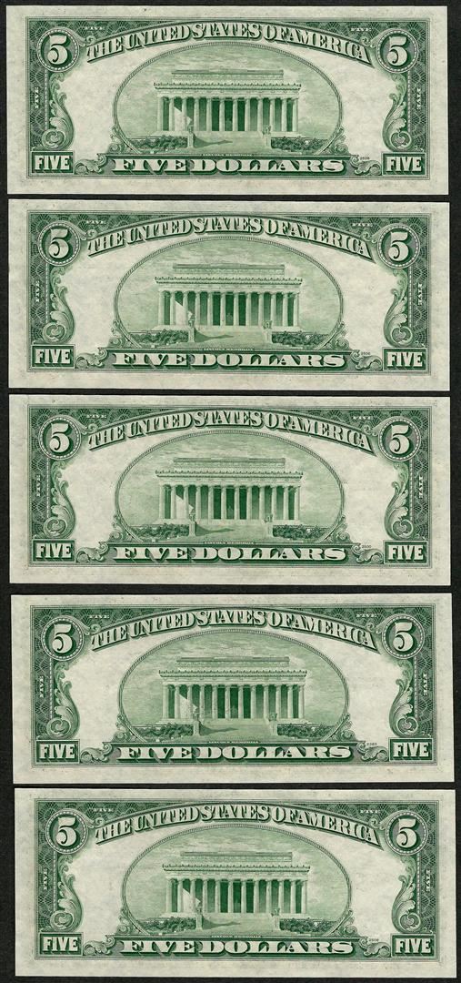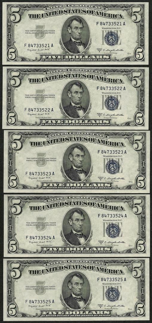 One Lot of (5) Consecutive 1953B $5 Silver Certificate Notes Gem Uncirculated.