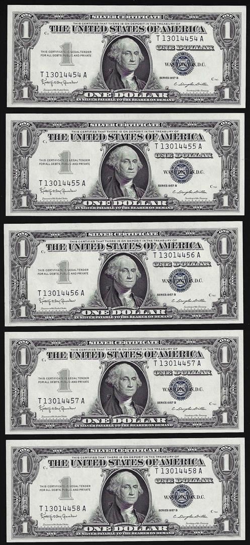 One Lot of (5) Consecutive 1957 $1 Silver Certificate Notes Uncirculated.