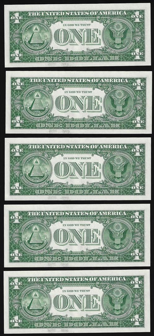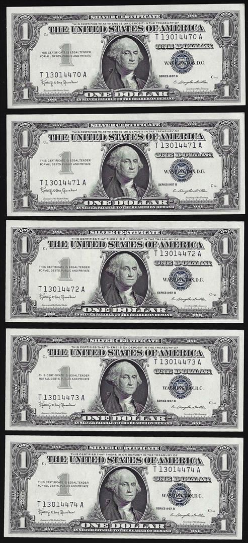 One Lot of (5) Consecutive 1957 $1 Silver Certificate Notes Uncirculated.