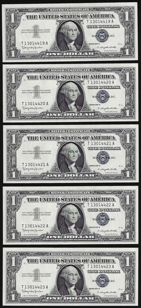 One Lot of (5) Consecutive 1957 $1 Silver Certificate Notes Uncirculated.