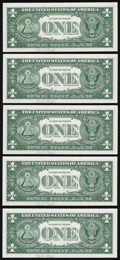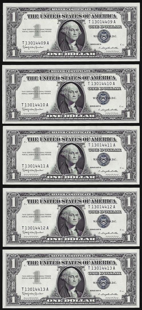 One Lot of (5) Consecutive 1957 $1 Silver Certificate Notes Uncirculated.