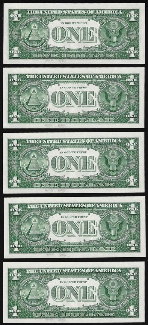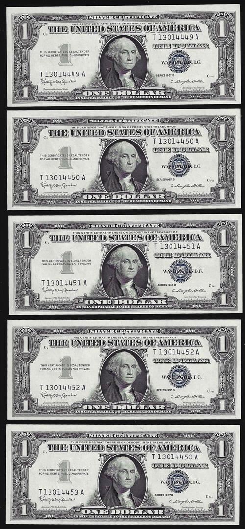 One Lot of (5) Consecutive 1957 $1 Silver Certificate Notes Uncirculated.