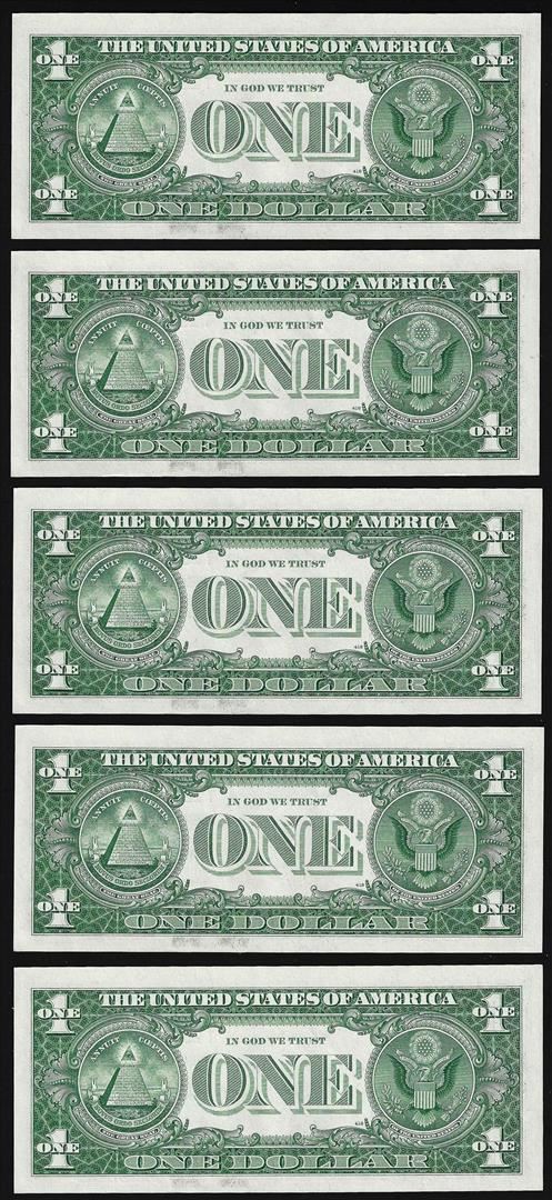 One Lot of (5) Consecutive 1957 $1 Silver Certificate Notes Uncirculated.