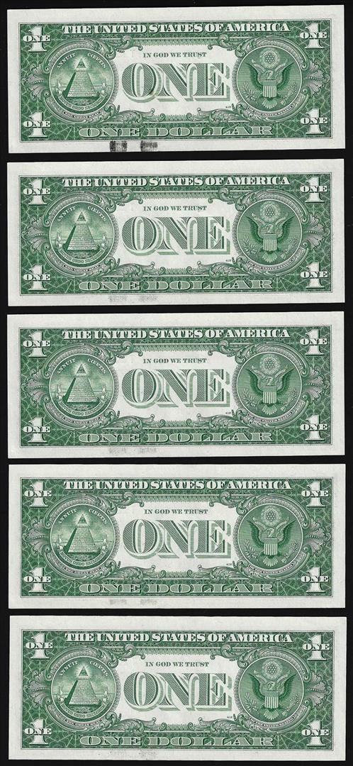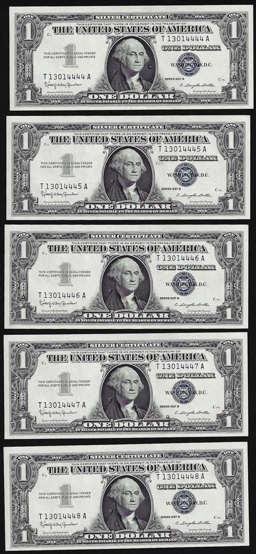 One Lot of (5) Consecutive 1957 $1 Silver Certificate Notes Uncirculated.