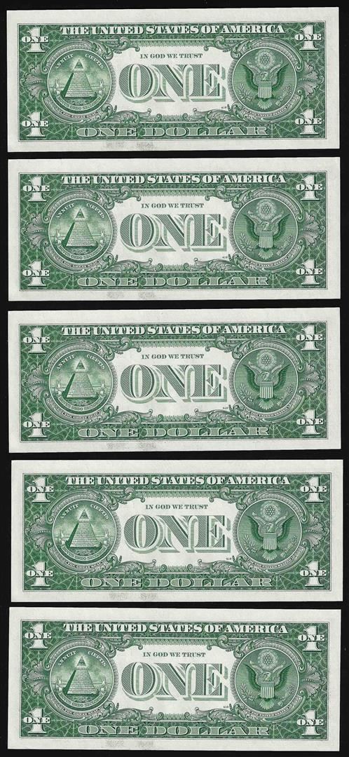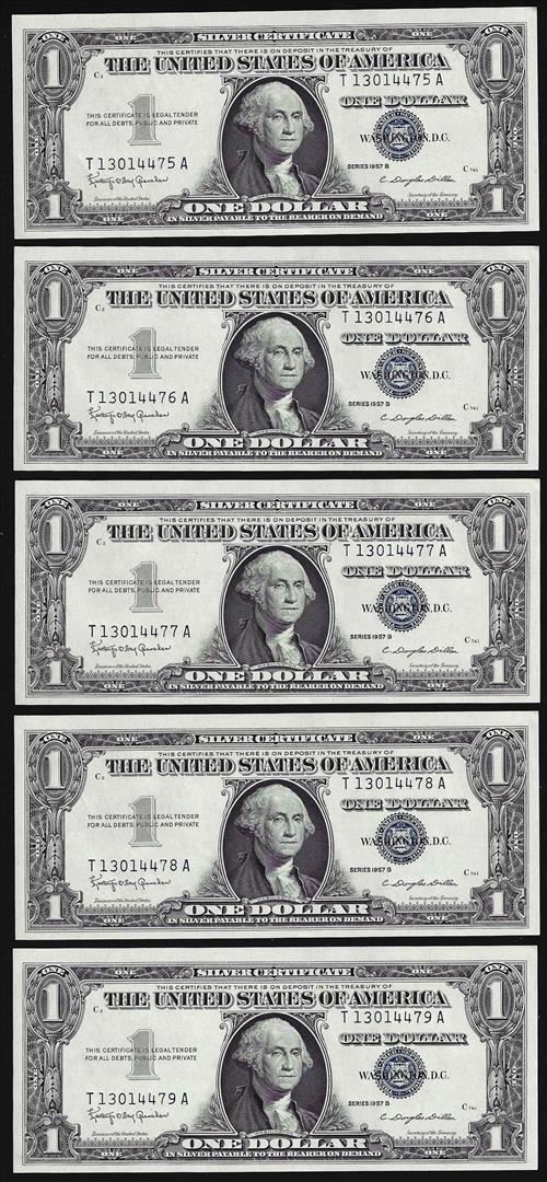 One Lot of (5) Consecutive 1957 $1 Silver Certificate Notes Uncirculated.