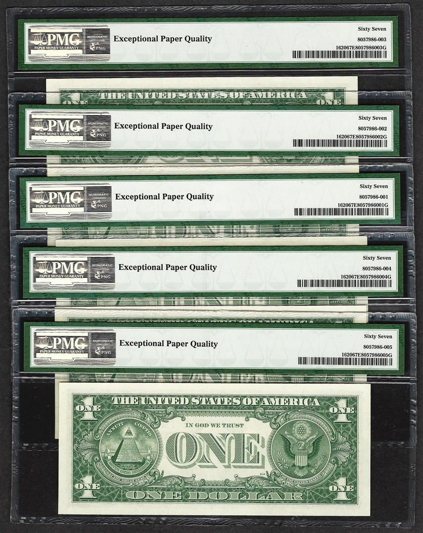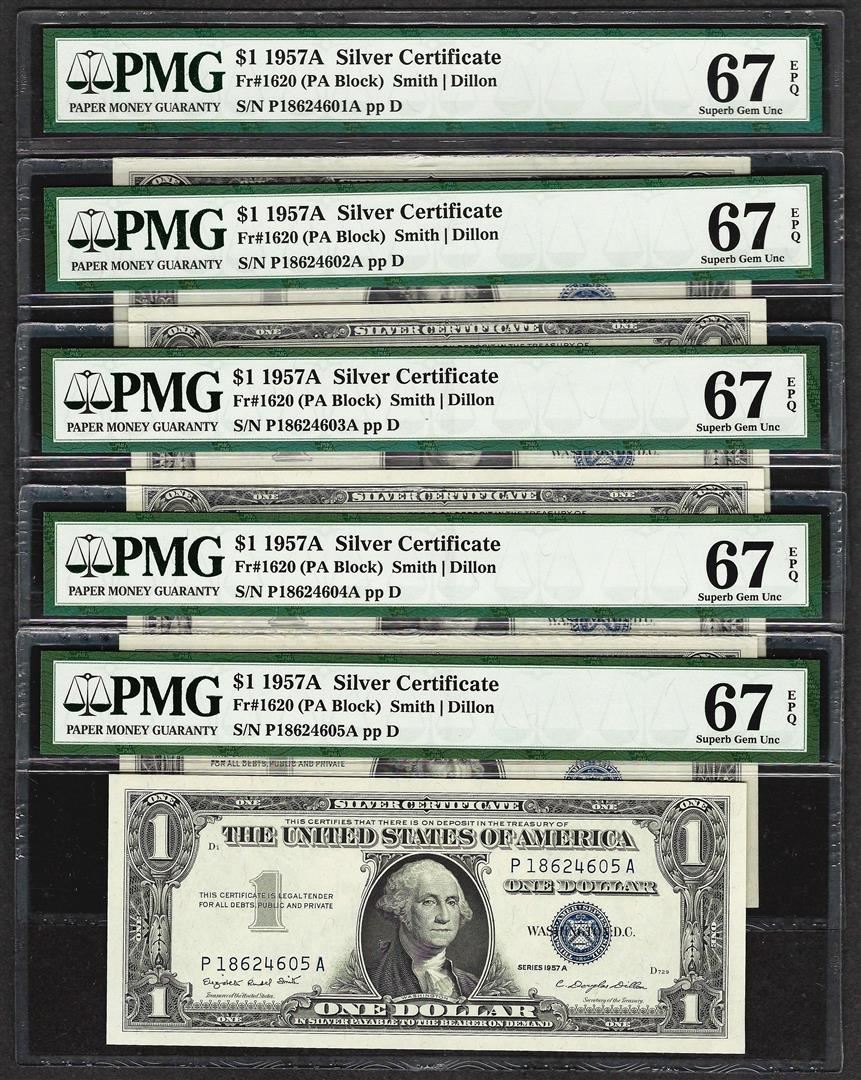 One Lot of (5) Consecutive 1957A $1 Silver Certificate Notes PMG Superb Gem Unc. 67EPQ. PMG Certified.