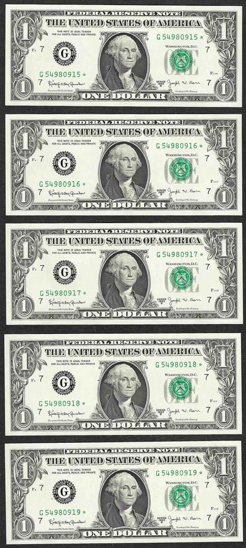 Lot of (5) Consecutive 1963B $1 Federal Reserve BARR STAR Notes