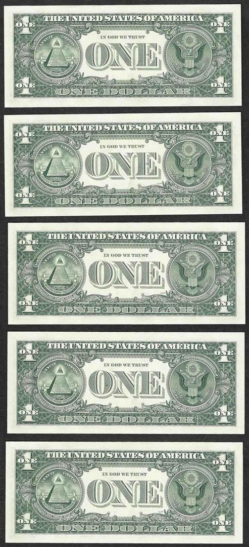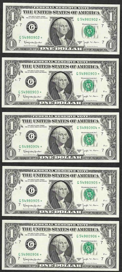 Lot of (5) Consecutive 1963B $1 Federal Reserve BARR STAR Notes