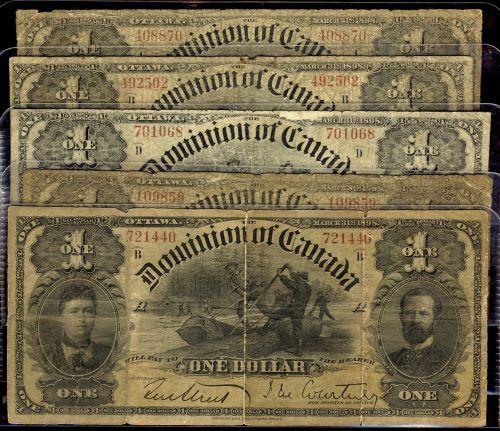 Lot of 5 DC-13a 1898 $1 notes. Grades vary from Good to VG.