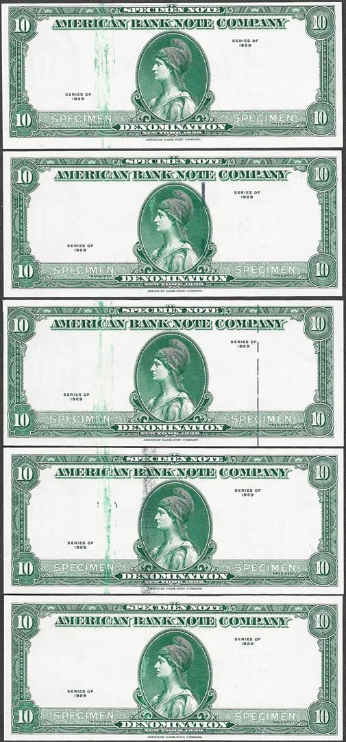 Lot of (5) Different 1929 Ten Unit American Bank Note Company Test Notes