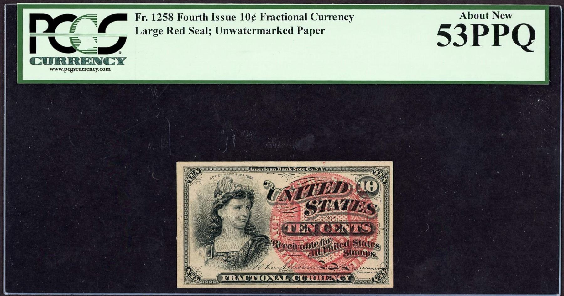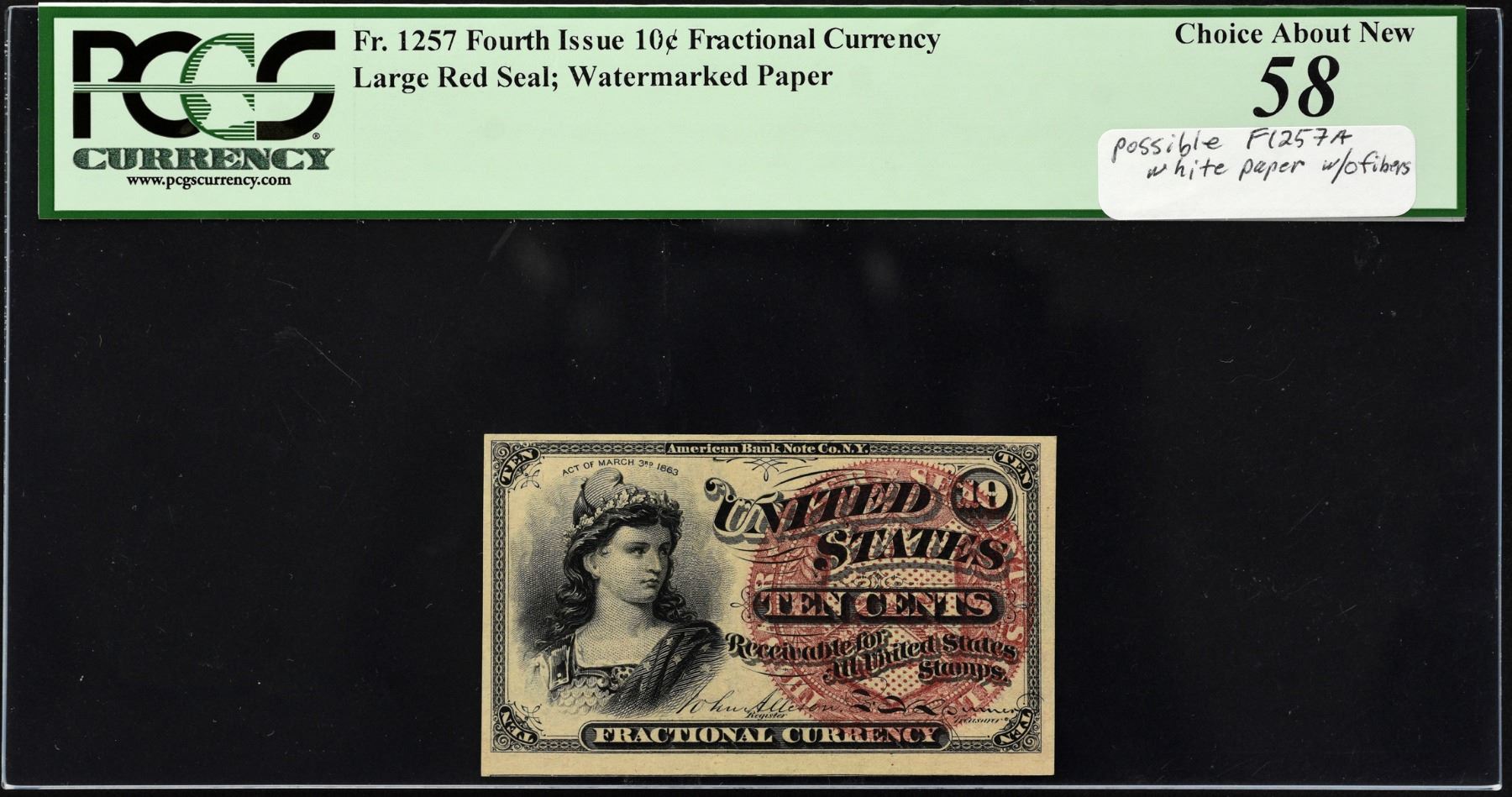 A complete type set for this 10 Cent deisgn with the following; Fr. 1257 in Choice About New 55; Fr. 1257 (some call this Fr1257(a) with few fibers) in Choice About New 58 with the comments "Minor Mounting Remnants on Back."; Fr. 1259 in Choice About New 58 PPQ; Fr. 1261 in Choice About New 58.
