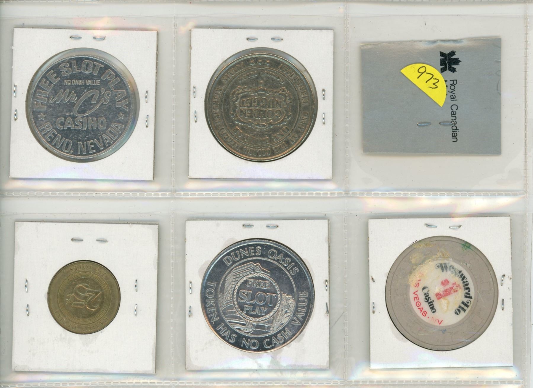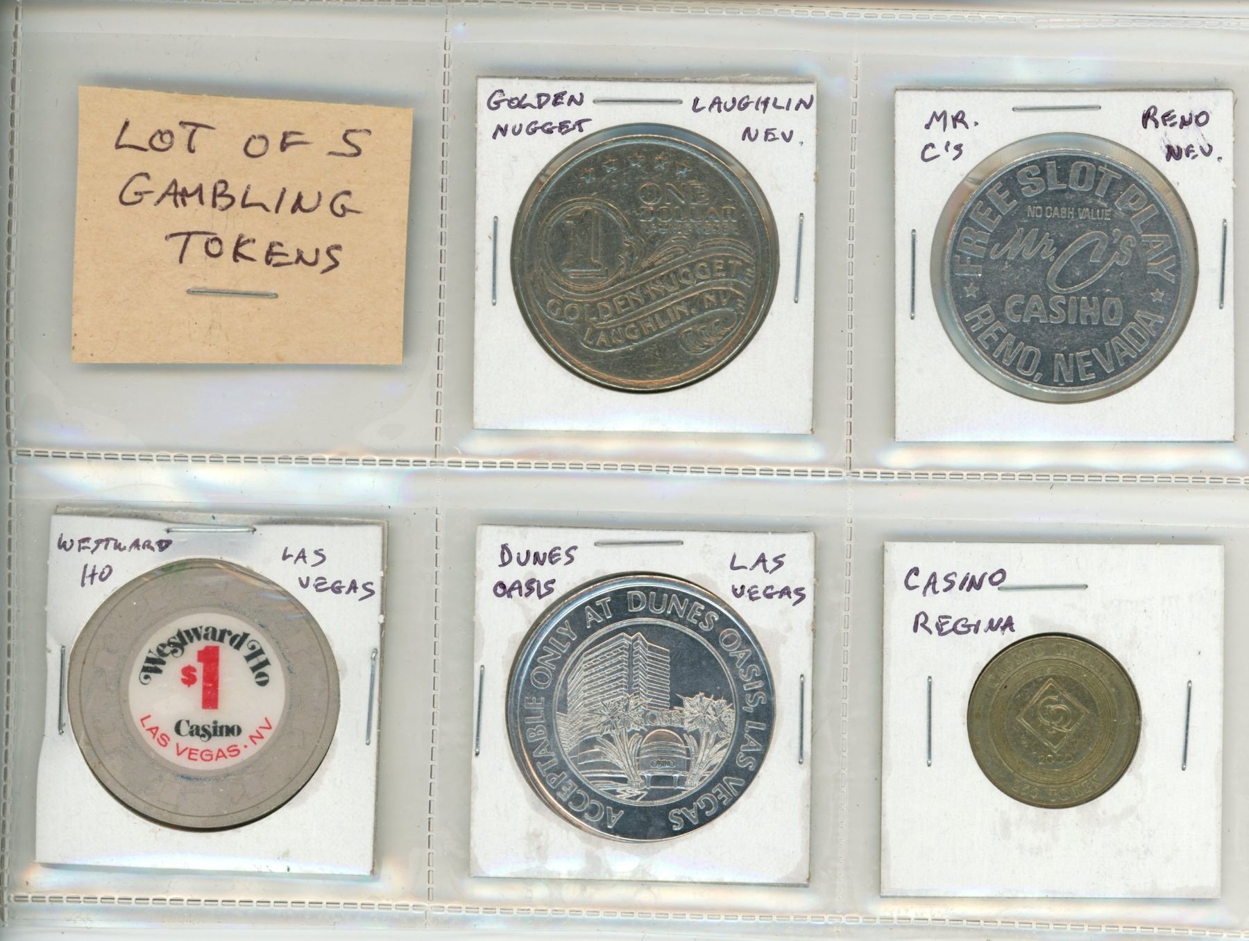 Lot of 5 Gambling and Slot Machine Tokens, 4 from Nevada, one from Regina. All Unc.