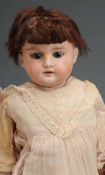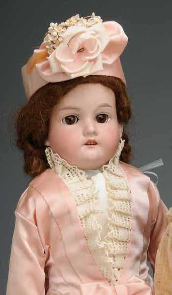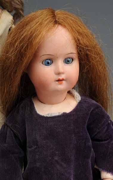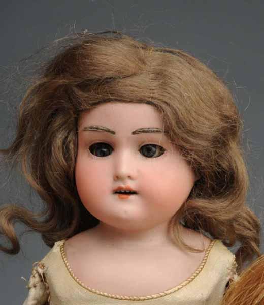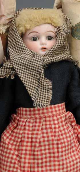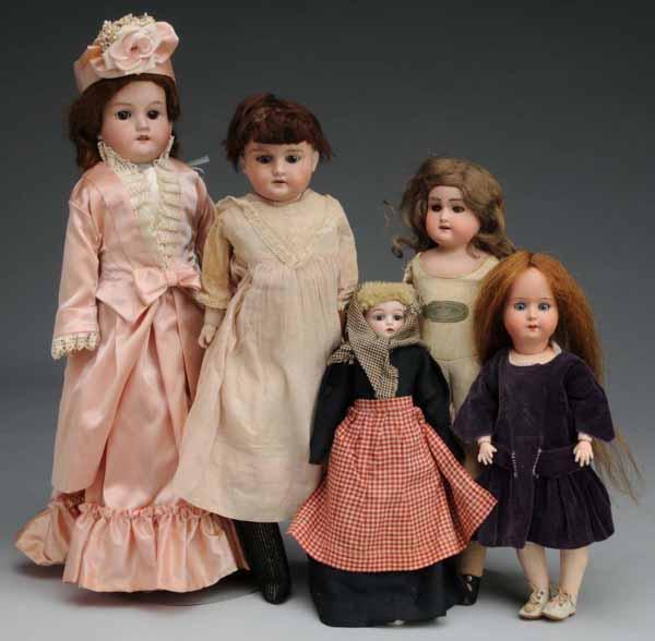 Description Germany, Ca. 1900. Bisque shoulder head A.M. 370, set eyes, kid body with bisque lower hands (one glued), dressed: another A.M. 370, eyes present but need to be reset, kid body bisque hands, original dress, undies and stockings; Bisque shoulder head with Horseshoe mark (crack on face), oil cloth body, peasant dress; another A.M. 370 with Miss Millionaire label, original mohair wig, kid body with bisque hands; bisque head by Goebel (some scuffs on face, jointed composition body, vintage shoes. Condition (Good - Excellent). Size Largest: 22" T.