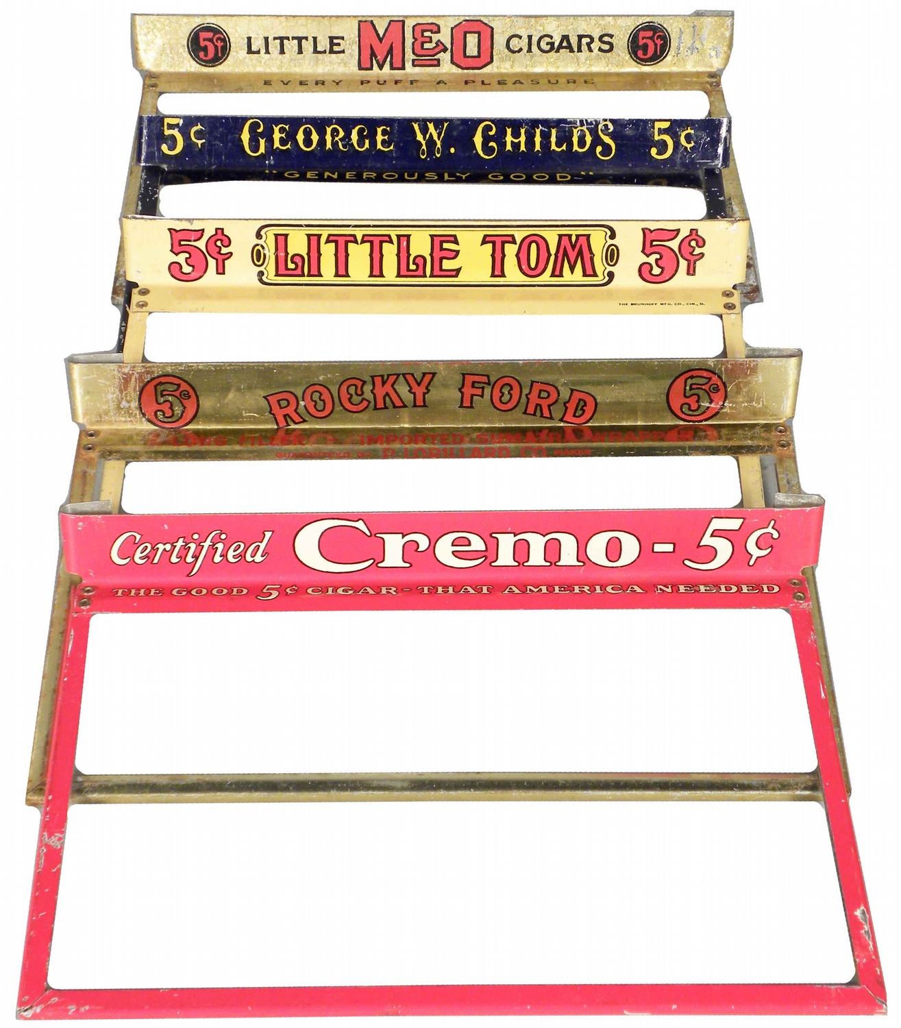 Lot of 5 Glass Cigar Box Lids. Cremo, Rocky Ford, Little Tom, George W. Childs and Little M & O Cigars. All in excellent condition.