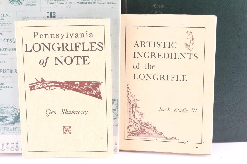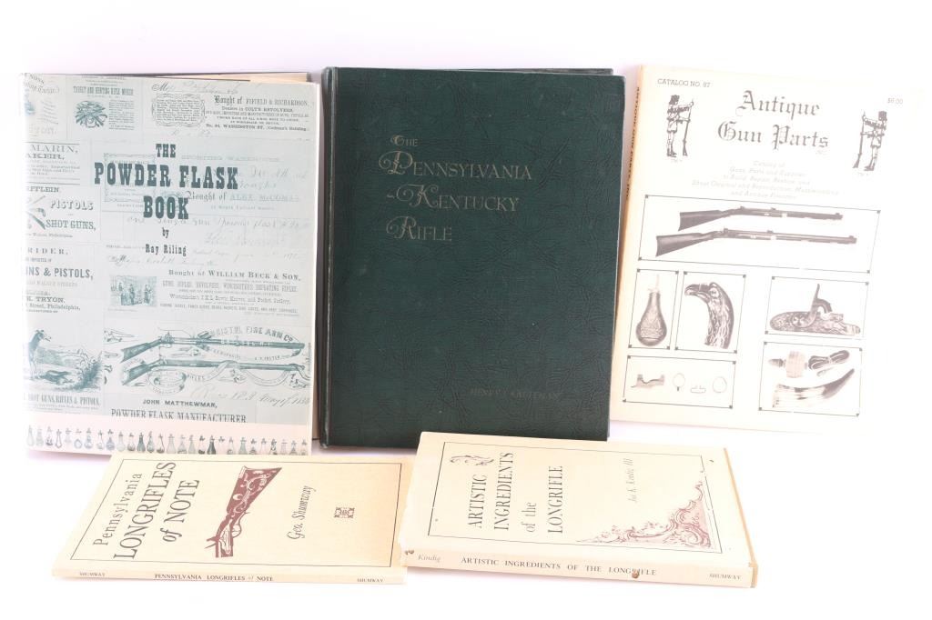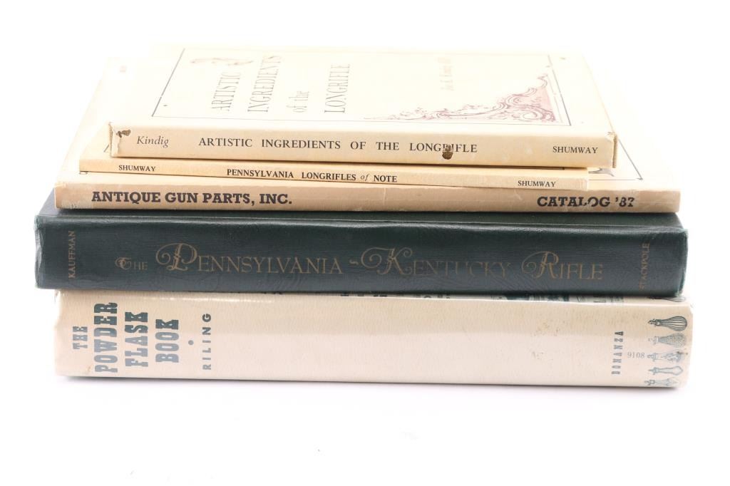 Includes: The Pennsylvania-Kentucky Rifle (Copyright 1960) Gilt lettering on dark green textured cover. 376 pages. Gilt lettering faded. In good condition; The Powder Flask Book by Ray Riling; Pennsylvania Longrifles of Note (1st Ed.) by George Shumway; Antique Gun Parts Inc, Catalog No. 87 (1987).