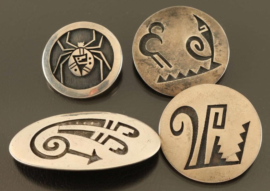 (1) Sterling Spider Pin made by Acaric Poleqapteva maked (1) Sterling Hopi geometric pin made by cedric Navenma (1) Sterling hopi Moon and cactus Pin made by Eldon James (1) Sterling Hopi pin made by Dennis Namingha From the Spike Flanders Collection Silver City New Mexico.