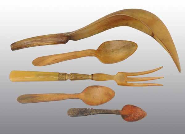 Description Used for cooking and eating. Includes three spoons, one fork, and one scooping dipping/ ladle utensil. Condition (Excellent). Size Largest: 12" L.