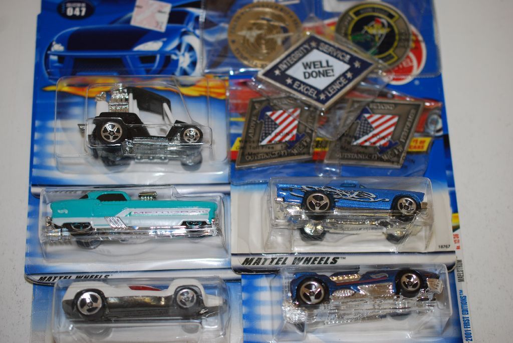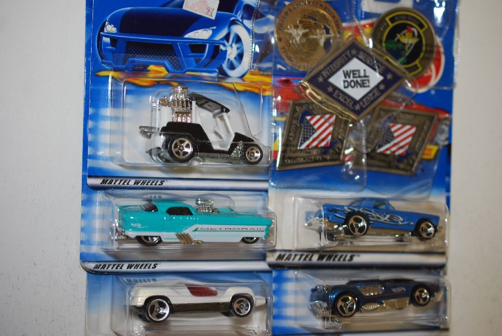 Lot of 5 Hot Wheels; Ghostly Cool Speed Seeker, 2000 Metrorail, 2000 Tee'd Off, 1957 T-Bird, 2001 Maelstrom; and a lot of 5 Various Challenge Medals; EST. $40-60