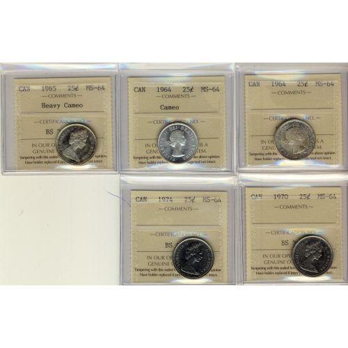 Lot of 5 ICCS MS-64 25¢ pcs. Includes 1964, 1964 CAMEO, 1965 HEAVY CAMEO, 1970, 1974