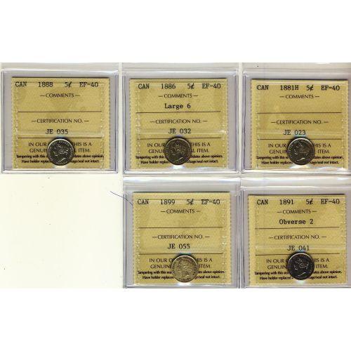 Lot of 5 ICCS graded EF-40 Five Cents; 1881H, 1886 Lg.6, 1888, 1891 Obv#2, 1899