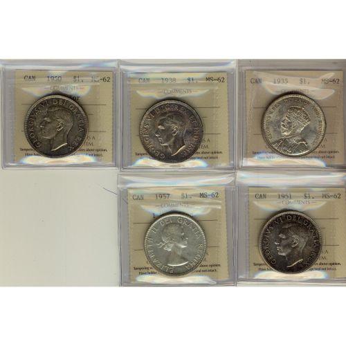 Lot of 5 ICCS graded MS-62 Silver dollars; 1935, 1938, 1950 Arnp., 1951, 1957 1 WL
