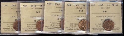 Lot of 5 ICCS graded Small cents; 1936, 1938, 1940, 1943, 1946. All MS64 Red.