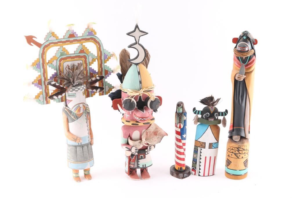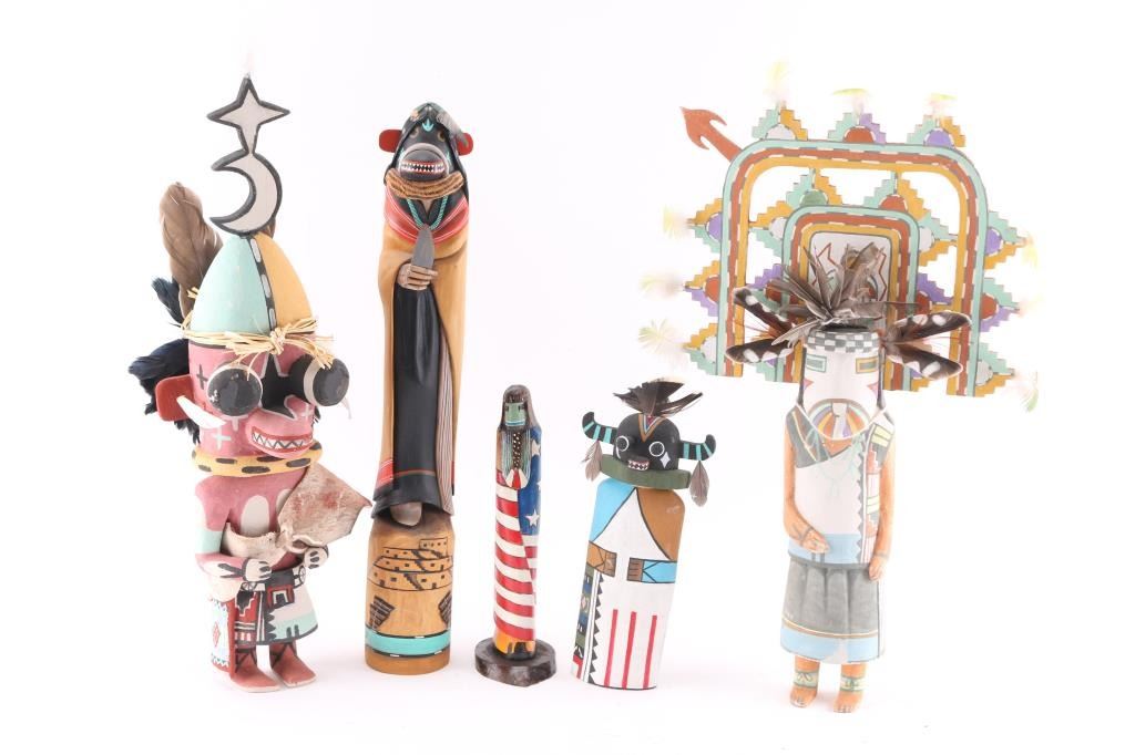 (1) Ogre kachina by CWT!! signed on bottom, measures 18" tall, in good condition. (1) Butterfly maiden kachina, measures 17" tall, in good condition but missing one arrow at top of headdress. (1) Ogre Lady kachina by Wilmer Kaye, signed on bottom, measures 16 1/2" tall, in good condition with one carved feather missing from top of head. (1) Flatback ogre kachina measuring 8", signed on back. (1) American flag kachina by P. Pino, 2010, measures 8 3/4" tall.