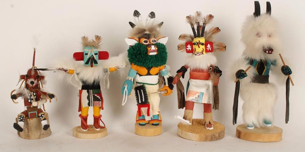 Wood construction with fur and feather accents. Hand painted. Antelope Boy, A-Ha, Eagle Dancer, and 2 others. Some signed on base.