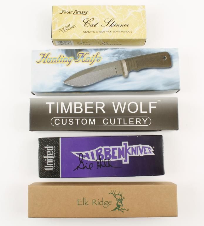 Includes (1)Frost Cutlery Cat Skinner, 6" overall, 3" blade; (1)Timber Wolf, TW16, 9 1/8" overall, 4 3/4" blade; (1)Elk Ridge, BR085, Hunter, 9 1/2" overall, (1)Hibben, GH2017, Alaskan Game Hunter, 6 15/16" overall, 2 3/4" blade; and (1)Fury, 9 1/4" overall, 4 3/4" blade.