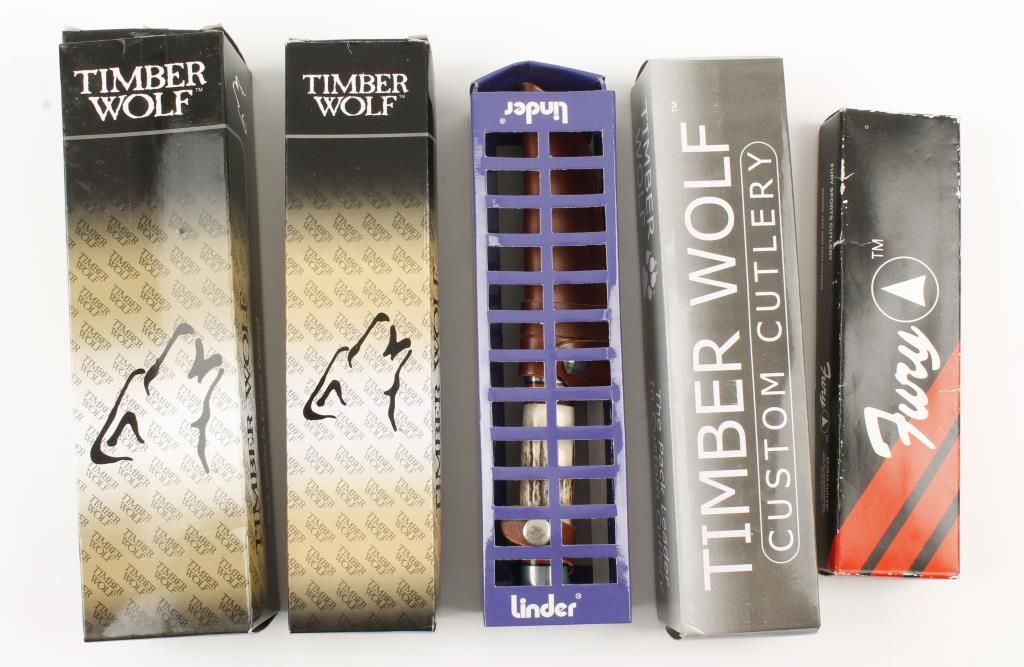 Includes (1)Linder, 7 1/2" overall, 3 1/2" blade; (1)Fury, Sport, 7" overall, 3 1/2" blade; (1)Timber Wolf, TW58, 8 1/2" overall, 4" blade; (1)Timber Wolf, TW15, 8 3/4" overall, 4" blade; and (1)Timber Wolf, TW13, 9" overall, 4" blade.