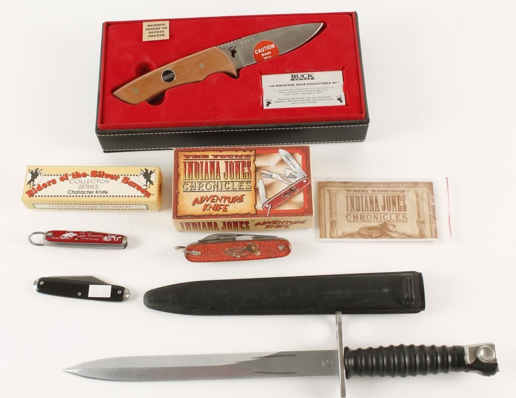 (1) Swiss Bayonet, (1) Rides of the Silver Screen, (1) Zorro Knife, (1) Indiana Jones, (1) Buck Knife White Tail Deer Collectable.