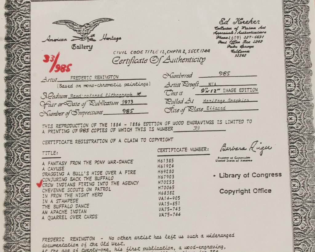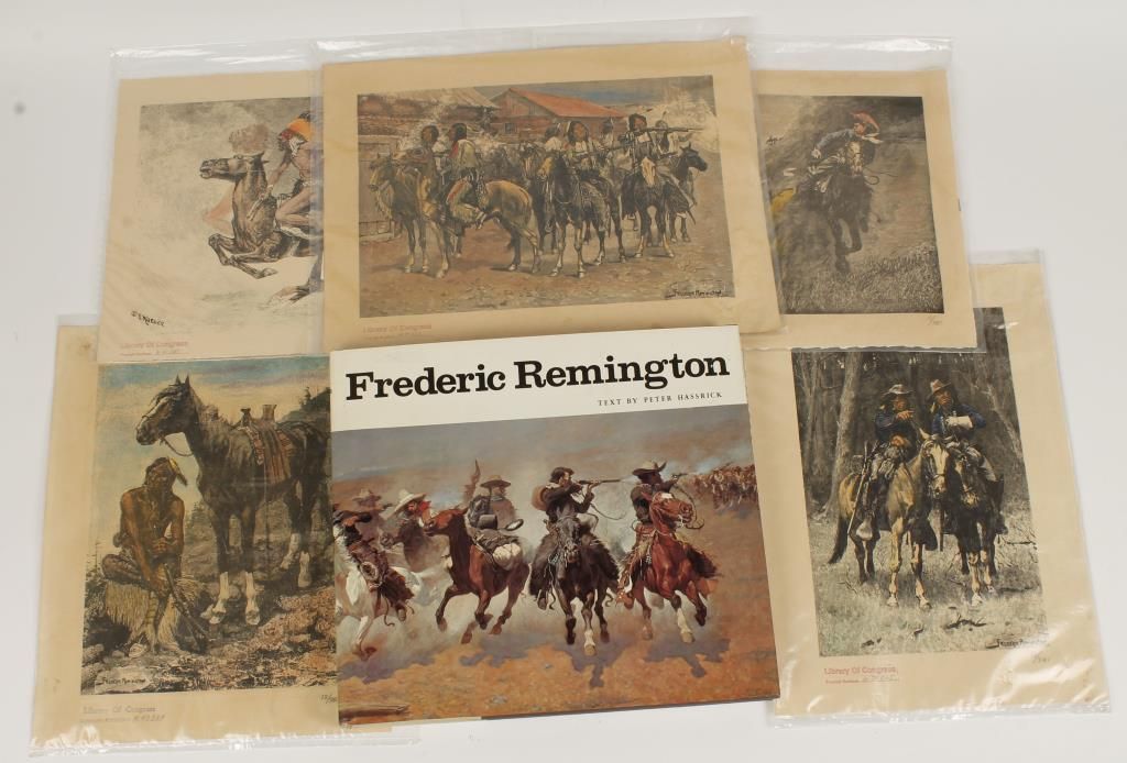 All hand-colored and numbered in pencil. All stamped on front "Library of Congress Copyright Certificate" with certificate number in pencil. Each Lithograph includes a certificate of authenticity from Ed Kreher from the Collectors of Western Art Appraisals/ Authentication's. (1) "A Fantasy From The Pony War-Dance" depicting an Indian on horseback, #9/985. (1) "A Cayuse", depicting an Indian and his horse, #12/985. (1) "Dragging A Bull's Hide Over A Fire", depicting two men on horseback dragging a bull over a fire line, #13/985. (1) "Cheyenne Scouts on Patrol" featuring two Native American Scouts on horseback, #12/985. (1) "Crow Indians Firing Into The Agency" depicting Indians on horseback firing rifles, #33/985. Also included is the book "Frederick Remington" by Peter Hassrick.