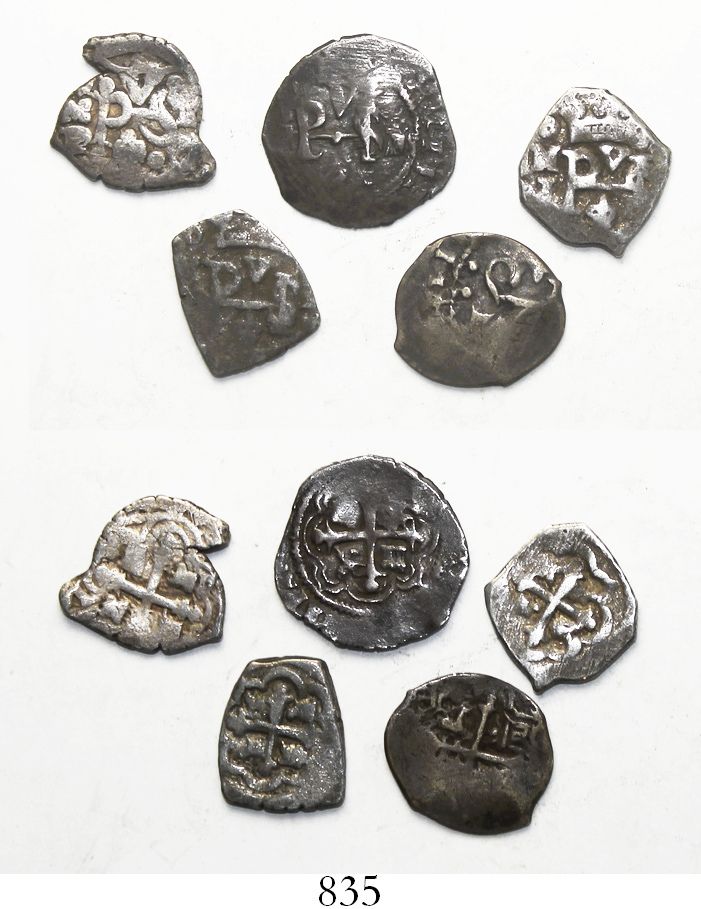 Lot of 5 Mexico City, Mexico, cob 1/2R, various periods (Philip IV to Philip V) and assayers, all pedigreed. 7.92 grams total. Nice F-VF, decent details, one neat shape, but best aspect is each coin's modern history documented by accompanying tags. Pedigree tags include: Norweb/Brand, Pradeau, Pat Johnson and "La Meseta Central" (2).