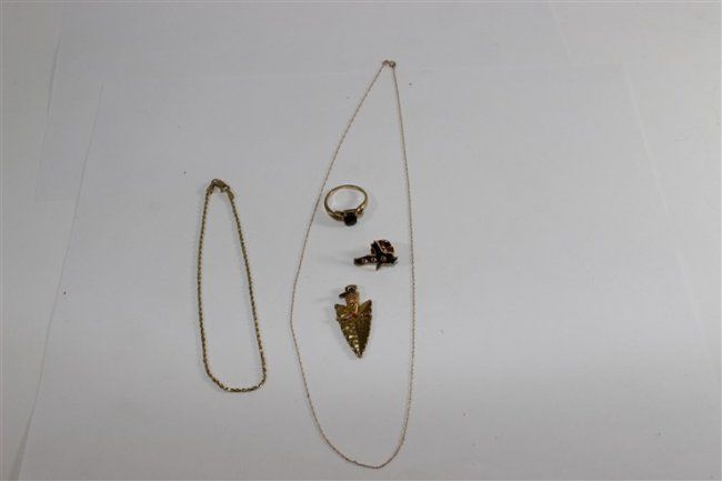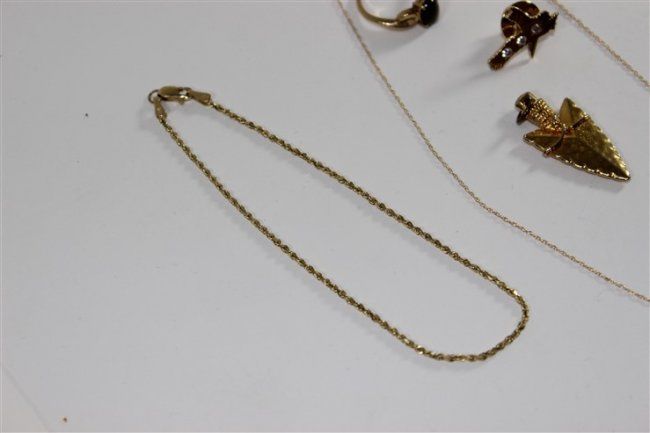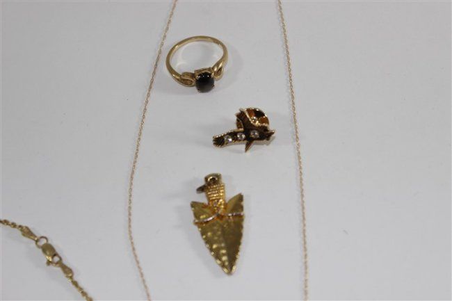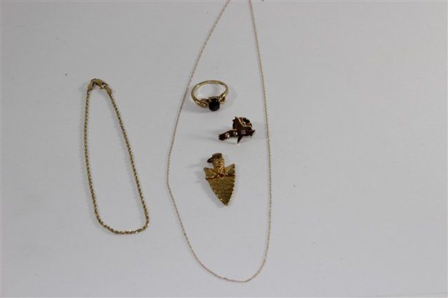 gold bracelet stamped 14k, stamped 14k pin, gold arrowhead pendant, 14k chain, ring size 7